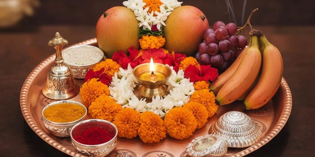 Flowers, Kumkuma, Panchamrutam Fruits or Coconut & Nava Naivedhyams